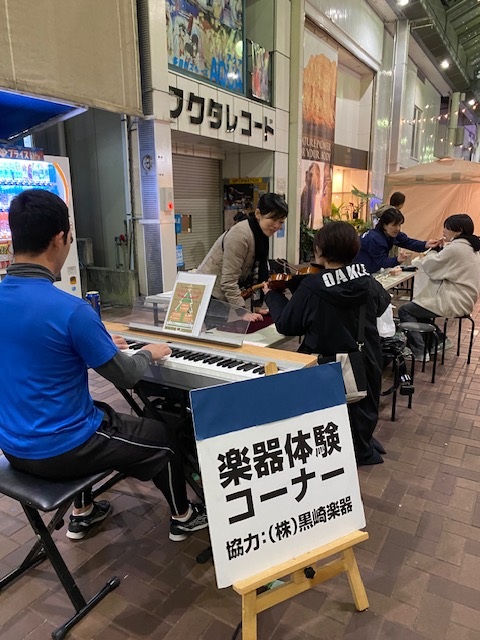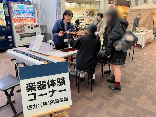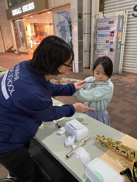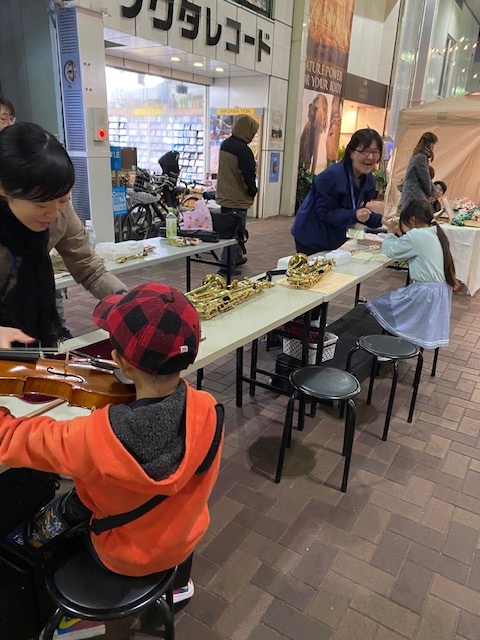 通りがかりの方にお声かけさせていただくと「えー、楽器やったことないけん、無理無理」と首を横に振りながらも、体感していただくと、意外にすぐに音が出て「えー🎵楽しい‼」と、フルート、サックス、バイオリン…ご用意した3種類の楽器全てを体感していただいたお客様も(^^